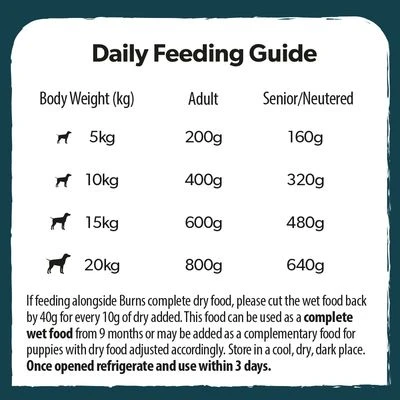The Burns range of wet dog food includes three delicious varieties of moist food for dogs. This Lamb, Vegetables & Brown rice variety is made from premium quality lamb and the recipe is adapted to your dog’s natural requirements. The handy pouches are the perfect size for meal times and form the basis for a healthy, balanced diet. They are ethically produced and made using as many ingredients from the Burns’ own farm as possible. Those ingredients not grown on the farm are from sustainable, ethical sources. As with all Burns products, this is a high quality food developed to promote good health and longevity.