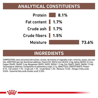 The digestive tract is one of the most sensitive organs in dogs, and it can suffer with various unpleasant conditions. Many dogs suffer with chronic diarrhoea or vomiting, which can mean that a long-term change of food is essential. Royal Canin Veterinary Canine Gastrointestinal Low Fat Mousse is a dietetic wet food for dogs that are overweight or require a reduced-fat diet. The lower fat content can help to improve digestion for dogs with hyperlipidaemia or acute pancreatitis. Highly-digestible proteins can reduce intestinal fermentation processes, whilst a lower fibre content helps ensure optimum nutrient absorption and can offer high digestibility. Fermentable fibres (dried beet pulp and FOS) can also encourage a balanced intestinal flora. The patented antioxidant complex in this Royal Canin Veterinary Canine Gastrointestinal Low Fat Mousse can help to protect against attacks from aggressive metabolites, as well as supporting your dog’s natural immune system.