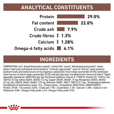 Gastrointestinal complaints are common in dogs, and growing dogs in particular often suffer from chronic and acute diarrhoea and sickness. Gastritis can also occur whilst puppies are growing, which can make a switch to dietetic dog food unavoidable. Royal Canin Veterinary Dog – Gastrointestinal Puppy is a dietetic complete dog food that has been adapted to the special nutritional needs of young dogs and puppies aged up to one year. The higher calorie content means that you can feed the food in smaller portions, which can help to ease the strain on your dog’s digestive tract. The recipe contains easily digested proteins that minimize intestinal fermentation processes. Fermentable fibres (FOS) promote balanced digestion and contribute to healthy gut flora. The dry kibble can be moistened, to ease the transition to solid food.